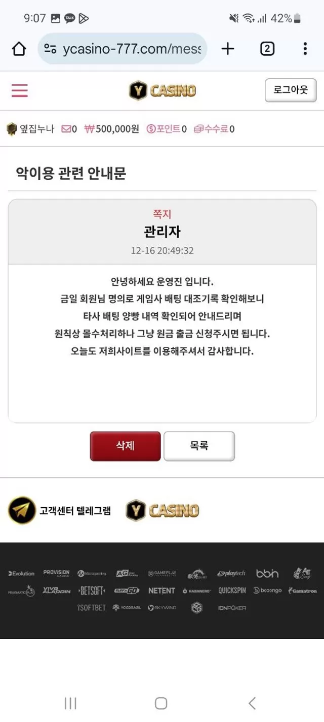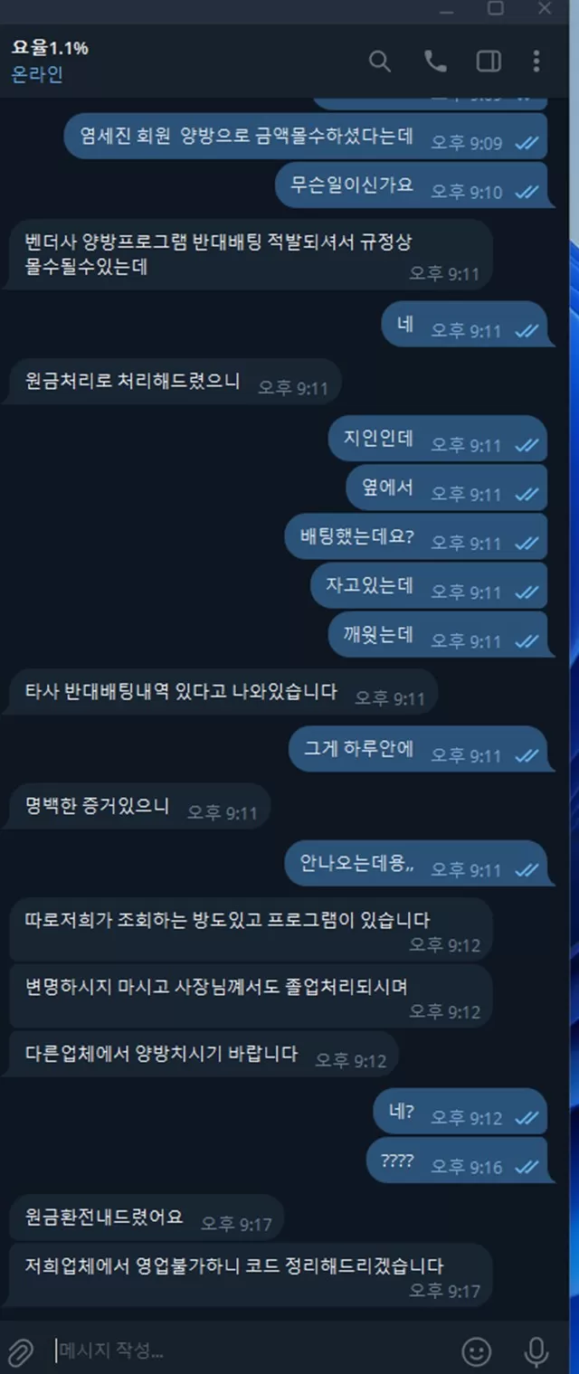 지인이 영업하는 와이카지노와 에이스카지노 계열사에서 50출 69환전으로 먹튀를 당했습니다. 참고로 첫 매는 받지 않고 요율만 받았고, 6시간 동안 1만 원씩 마틴으로 수익을 올렸습니다. 소액이긴 하지만 억울해서 글을 올립니다. 양방 내역을 보여달라고 하니 보여주지 않고 대화 내용을 바로 밀고 차단하더군요. 그래도 지인이 소액이라 19만 원은 개바시를 해줬지만, 이곳은 혼나야 할 것 같습니다. 절대 이용하지 마세요. 총판 코드까지 다 감아버리고 도망가는 악질입니다. 말만 하면 거짓말만 하고, 다들 먹튀 당하지 않도록 조심하세요!