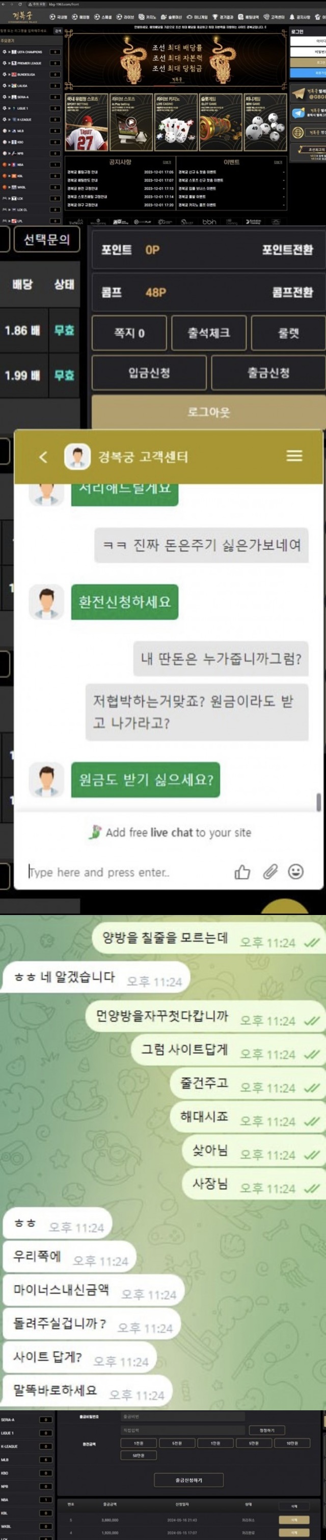 경복궁 메이저 사이트인 줄 알았는데, 총판과 짜고 치는 개병신 같은 사이트네요. 둘 다 텔레그램에서 동시 차단당했어요.